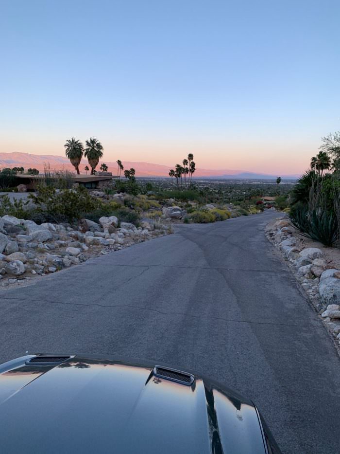 Olivia from the travel blog Nohzee embarks me on her convertible Ford Mustang to watch the sunset in the hills of Palm Springs. Love love love that little ride together: the amazing modernist houses North of Palm Springs. Leonardo Di Caprio’s Dinah Shore Estate by architect Donald Wexler (1964) on 432 West via Hermosa, right near Kirk Douglas Marilyn Monroe house at 1326 Rose Avenue. My favorite of all is the Kauffman house higher up on the hills with stunning views, by Richard Neutra at 470 West vista Chino.